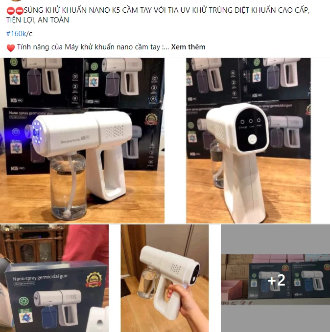 Tương tự, anh Hùng, một đầu mối bán máy khử khuẩn khác trên chợ mạng cũng đăng bài bán súng khử khuẩn loại K6X với mức giá chỉ 175.000 đồng/chiếc. Theo quảng cáo, súng khử khuẩn được sử dụng công nghệ phân tách các phân tử nước thành những hạt nhỏ li ti đường kính 1µm dễ dàng hòa vào không khí giống như sương mù, do đó tiêu diệt 650 loại vi khuẩn, virus và mùi khó chịu, máy còn sử dụng được các loại tinh dầu đuổi muỗi, côn trùng.