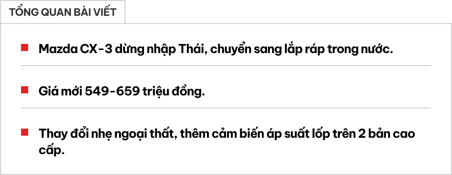 Mới đây, THACO Auto thông báo lắp ráp Mazda CX-3 tại Việt Nam trên website chính thức. Trước đây, mẫu xe này được nhập khẩu nguyên chiếc từ Thái Lan. Mazda CX-3 lắp ráp trong nước có 4 phiên bản: AT, Deluxe, Luxury và Premium, giá bán lần lượt 549 triệu, 579 triệu, 619 triệu và 659 triệu đồng.