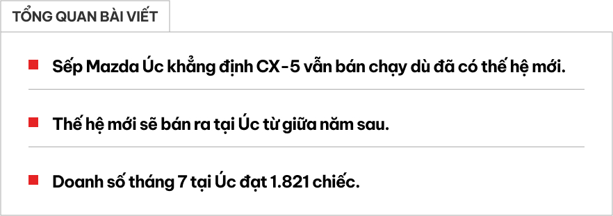 Lãnh đạo Mazda Úc cho rằng doanh số bán hàng của Mazda CX-5 sẽ không bị ảnh hưởng nhiều dù thế hệ mới ra mắt.