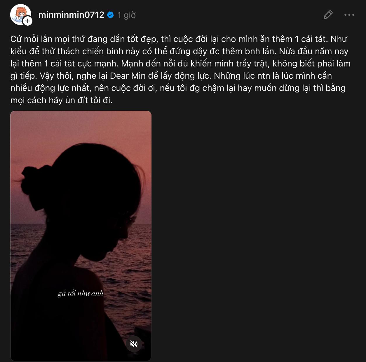 Tâm thư của MIN: "Cứ mỗi lần mọi thứ đang dần tốt đẹp, thì cuộc đời lại cho mình ăn thêm 1 cái tát. Như kiểu để thử thách chiến binh này có thể đứng dậy đc thêm bnh lần. Nửa đầu năm nay lại thêm 1 cái tát cực mạnh. Mạnh đến nỗi đủ khiến mình trầy trật, không biết phải làm gì tiếp. Vậy thôi, nghe lại Dear Min để lấy động lực. Những lúc như thế này là lúc mình cần nhiều động lực nhất, nên cuộc đời ơi, nếu tôi đang chậm lại hay muốn dừng lại thì bằng mọi cách hãy ủn tôi đi".