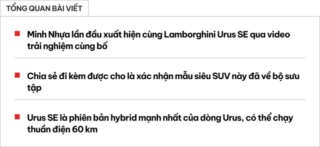Đi kèm video, Minh Nhựa chia sẻ dòng trạng thái: “Nay ngày đẹp nên mời ng truyền cảm hứng cho Minh chơi xe sang nhà thử xe. Sau khi chạy 1 vòng thì nhận được câu kết: Hợp lý quá, chắc mua thêm chiếc nữa.” Dù không nói trực tiếp, câu chia sẻ này được cho là ngầm xác nhận việc Minh Nhựa đã bổ sung Lamborghini Urus SE vào bộ sưu tập xe của mình.