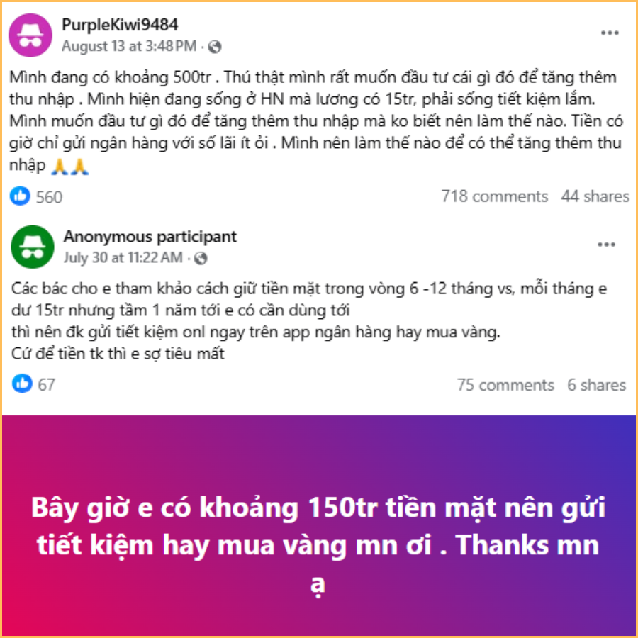 “Tiết kiệm được tầm 500 triệu thì mua vàng hoặc về quê mua đất là yên tâm, chứ tầm này kinh doanh gì cũng khó, có khi lỗ vốn hết mà đầu tư không có kiến thức thì cũng dễ mất cả chì lẫn chài. Cứ vàng với đất mà nhắm thôi” - Một người bình luận.