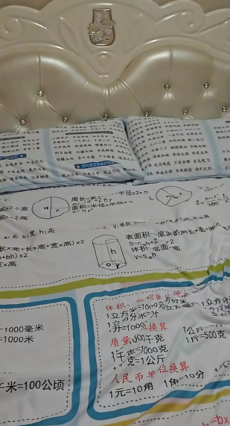 Bộ chăn ga này được thiết kế "độc lạ" với toàn bộ mặt vải in kín mít các công thức toán học và kiến thức trọng tâm, trình bày y hệt một cuốn sổ tay ôn thi khổng lồ. Thử hỏi, có đứa trẻ nào lại muốn đón tuổi mới trên một chiếc giường "đầy mùi bài vở" như thế?