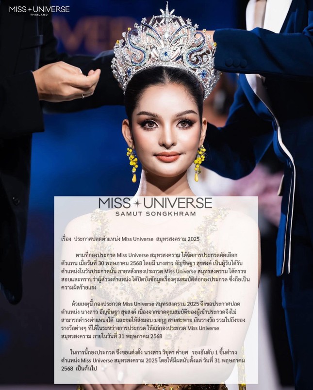 “Cô Anchistha Suksong không đủ điều kiện và năng lực để tiếp tục đảm nhận danh hiệu Hoa hậu Hoàn vũ Samut Songkhram 2025. Vì vậy, vương miện, dải băng, giải thưởng tiền mặt cùng các phần thưởng liên quan sẽ bị thu hồi, có hiệu lực trước 31/5”, ban tổ chức cho biết.