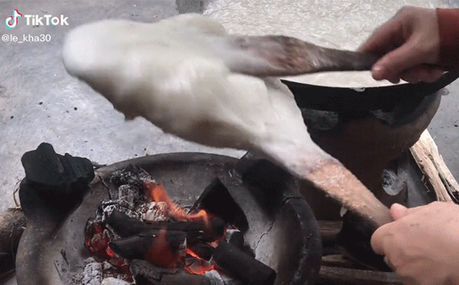 Ở vài nơi, người ta còn lấy bột ra hơ trên bếp lửa cho bánh săn hơn, để được lâu hơn như trong clip trên. Công đoạn này cũng đòi hỏi sự khéo léo bởi nếu không thì bột sẽ rơi xuống ngay.