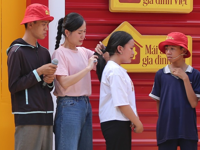 Lâm Vỹ Dạ bật khóc nức nở khi chứng kiến hoàn cảnh mồ côi của ba đứa nhỏ bằng tuổi con mình. Cô xin phép được tới cầm lược chải tóc cho em Ngọc Trang, vừa chải tóc, buộc tóc vừa khóc nức nở.