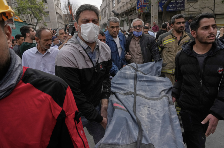 Thi thể một nạn nhân được đưa ra khỏi tòa nhà bị trúng bom trong cuộc không kích của Mỹ và Israel ở Tehran đêm 27/3. (Ảnh AP/Vahid Salemi)