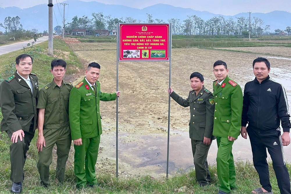Công an xã Đại Huệ cùng các lực lượng cắm biển cấm tại những khu vực thường xảy ra tình trạng săn bắt, đặt bẫy và khai thác trái phép