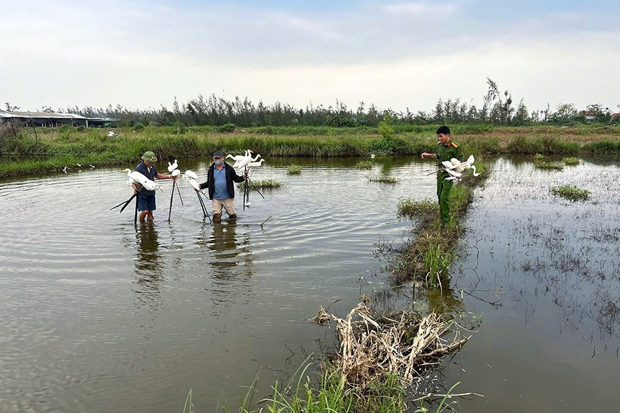 Xã An Châu là một trong những “điểm nóng” về tình trạng bẫy, bắt các loài chim hoang dã. Lực lượng chức năng đã mất nhiều ngày để tháo dỡ hàng nghìn cò giả bằng xốp cắm kín rừng ngập mặn và các bãi nuôi tôm. Que nhựa dính phủ trắng một vùng. Nhiều con vạc lớn bị khâu mắt làm mồi được giải cứu.