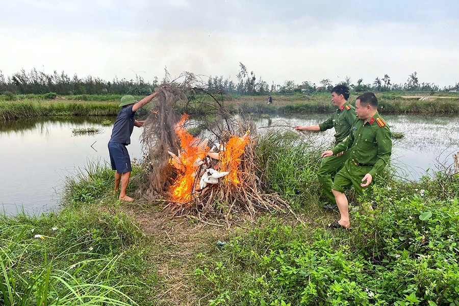 Lực lượng công an đốt, tiêu hủy lưới bẫy và chim giả bằng xốp.