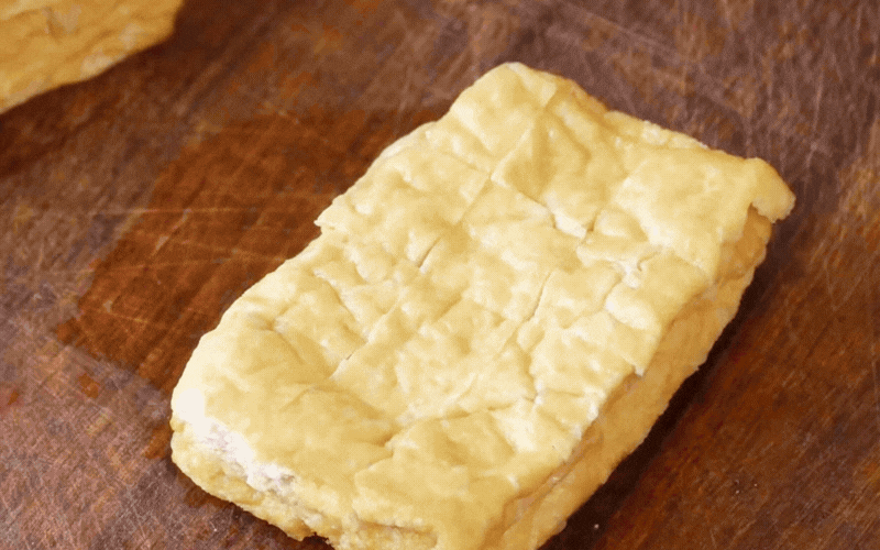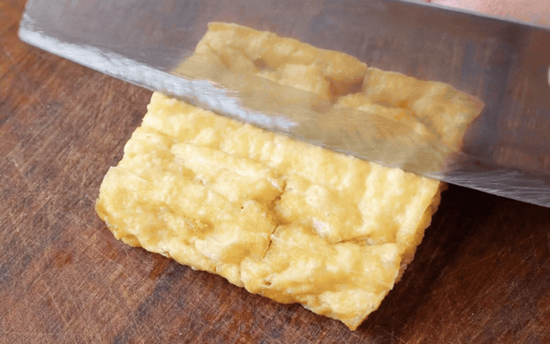 Đậu mua về rửa nhẹ tay dưới vòi nước, thấm khô rồi cắt làm đôi. Dùng dao khứa nhẹ các đường caro (vảy rồng) trên một mặt của miếng đậu. Bước này tuy nhỏ nhưng lại cực kỳ quan trọng, giúp gia vị len lỏi sâu vào từng thớ đậu khi sốt.