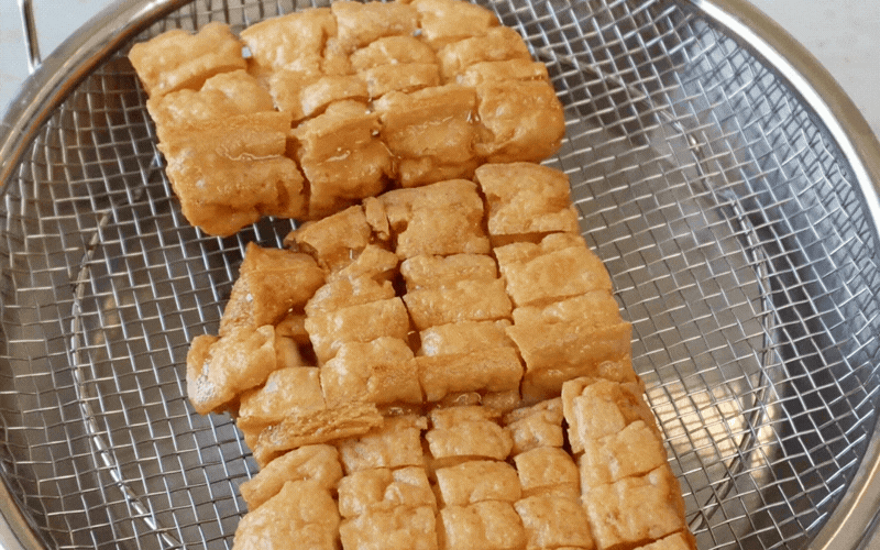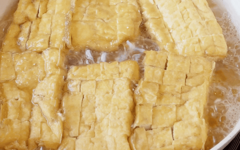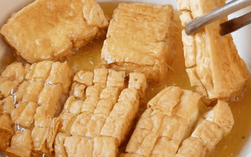 Bắc chảo lên bếp, cho dầu ăn vào đun nóng rồi thả đậu vào chiên ngập dầu đến khi vàng đều hai mặt. Vớt đậu ra rây lọc cho ráo dầu hoàn toàn.