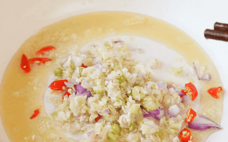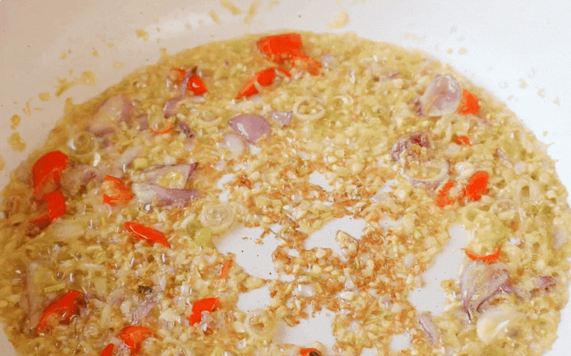 Chắt bớt dầu trong chảo vừa chiên, chỉ để lại một chút xíu. Cho toàn bộ sả, tỏi, hành tím và ớt băm vào phi trên lửa nhỏ cho đến khi dậy mùi thơm nức nở.