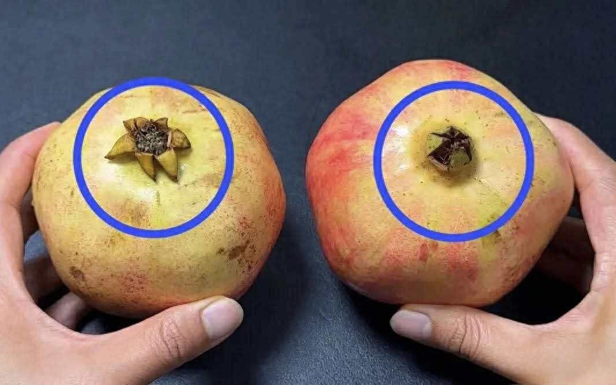 Khi quả lựu ngon và chín thì phần cánh ở rốn quả sẽ nở xòe hoàn toàn (quả bên trái màn hình).