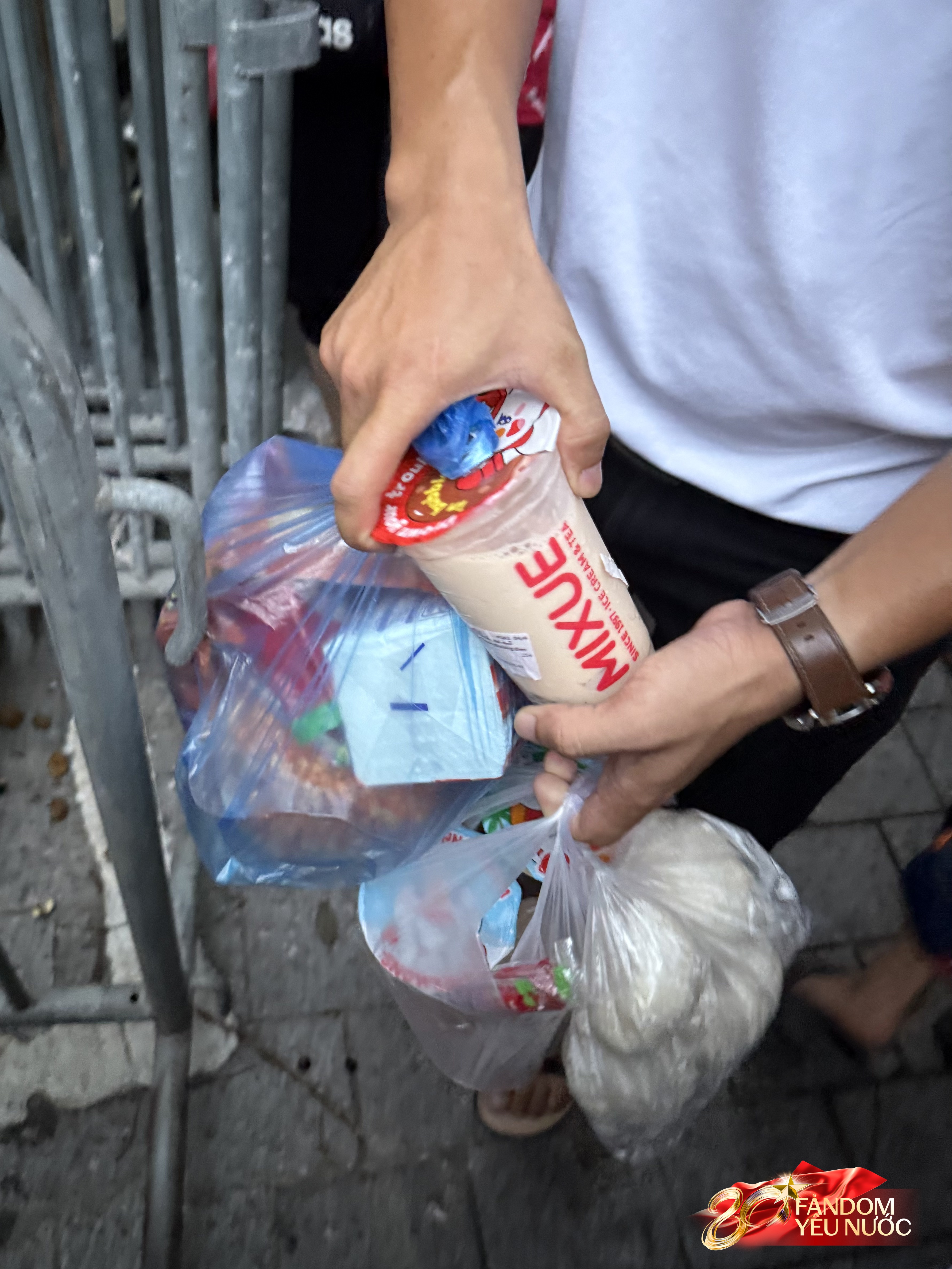 Để chuẩn bị cho những giờ phút chờ đợi đầy mong mỏi, người dân đã mang theo hoặc tranh thủ đi mua đủ loại đồ ăn để nạp năng lượng.