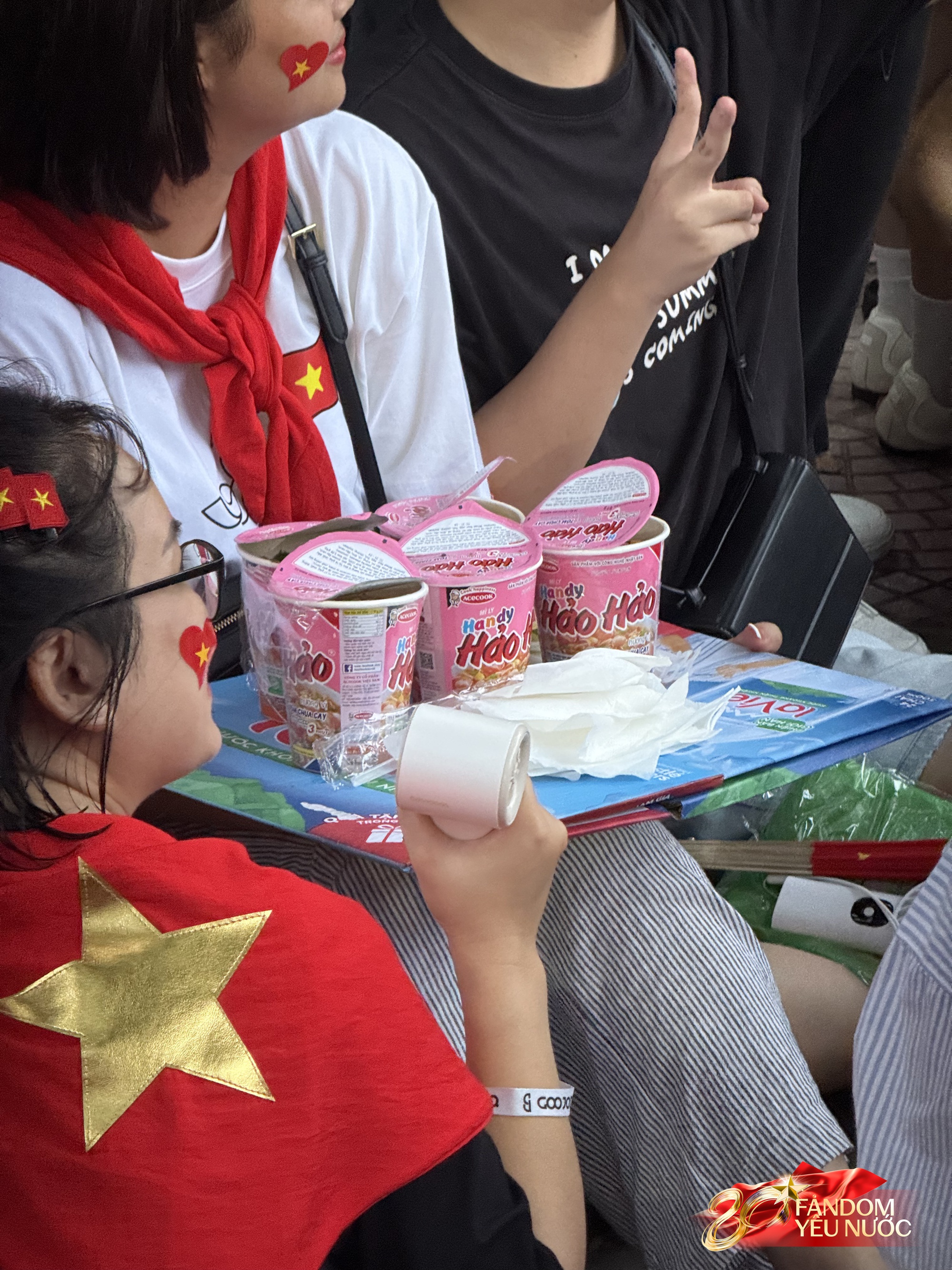 Món ăn “đắt hàng” nhất có lẽ là những gói mì ăn liền. Các nhóm bạn hay các gia đình cử một người ra ngoài mua và “chế biến” luôn để mang vào ngồi ăn ngay tại vị trí đang chờ đợi.