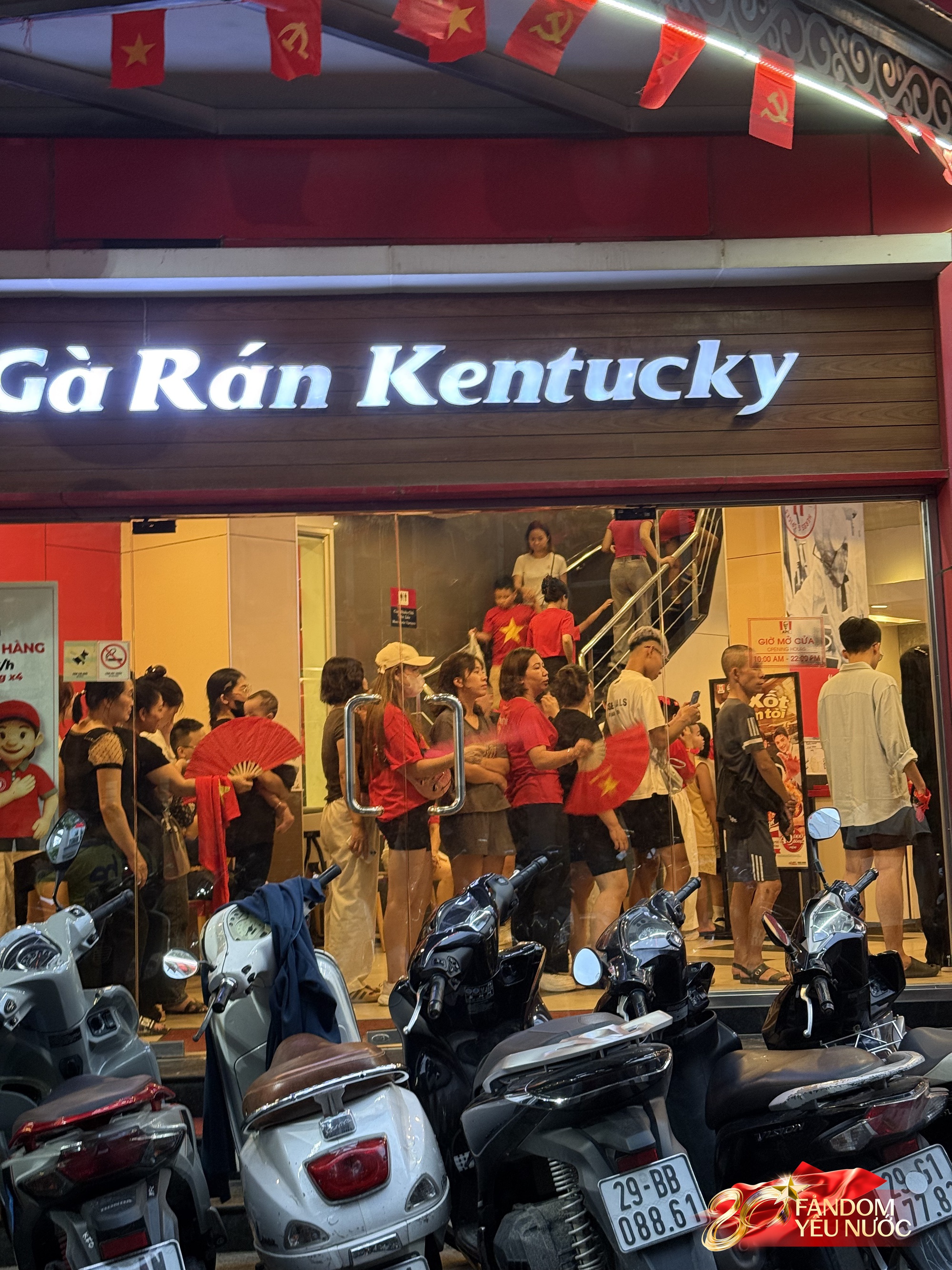 Trên các tuyến đường diễn ra buổi tổng hợp luyện, các cửa hàng đồ ăn nhanh cũng tấp nập khách ra vào. Tại cửa hàng KFC trên phố Nguyễn Thái Học, dòng người xếp hàng dài không ngớt chỉ để mua một phần gà rán hay một ly nước giải khát, tiếp thêm sức lực để tiếp tục chờ đón màn trình diễn lịch sử.