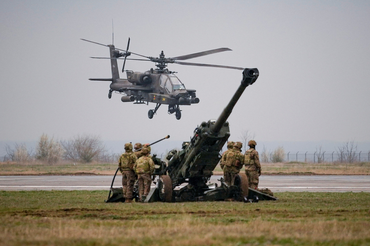 Trực thăng tấn công Apache của Sư đoàn Dù 101 Mỹ trong cuộc diễn tập tại căn cứ không quân Mihail Kogalniceanu, gần cảng Constanta bên bờ Biển Đen, Romania, ngày 31/3/2023. (Ảnh: AP/Vadim Ghirda)
