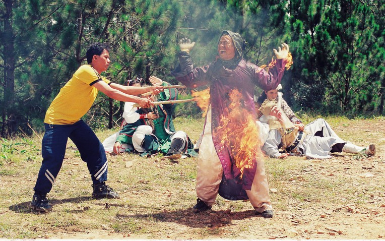 Tới ngày quay thật thì xảy ra rất nhiều cảnh kinh hồn. Ở Việt Nam, một người bay thì 2, 3 người kéo. Ở bên đó, họ cột 50 sợi dây cho 50 người bay lên.