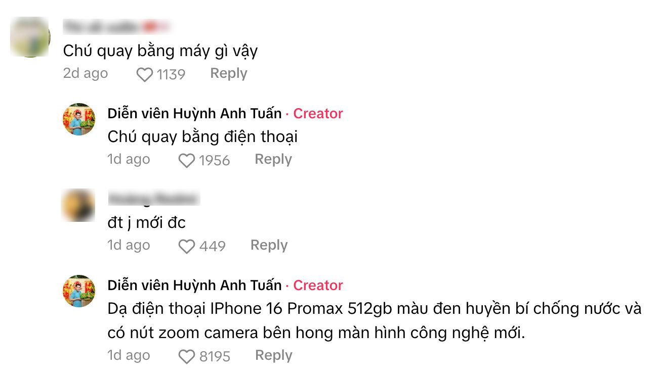 Chưa dừng lại ở đó, khi được hỏi quay video bằng gì và đã trả lời là "điện thoại" nhưng vẫn chưa làm hài lòng dân mạng, đứng trước câu hỏi "điện thoại gì", nam diễn viên không ngại ngần chia sẻ chi tiết về chiếc điện thoại để người hỏi thật hài lòng với câu trả lời.