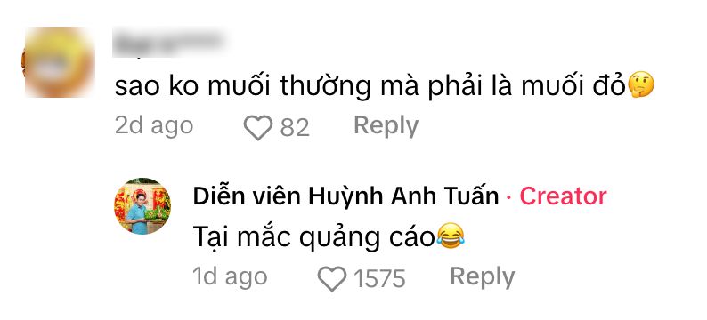 Và sự thú vị nằm ở chính màu của những hũ muối màu sắc này, khi một dân mạng thắc mắc rằng tại sao phải dùng muối đỏ mới được. Đáp lại vừa thật thà lại vừa hài hước, nam diễn viên Huỳnh Anh Tuấn khiến dân tình không khỏi bật cười khi nói rằng: "Tại mắc quảng cáo".