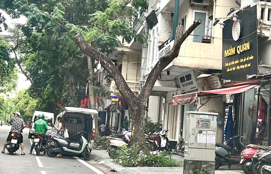 Tương tự, trên các tuyến phố Xuân Thủy, Hàng Bông... cũng xuất hiện một số cây xanh đã có dấu hiệu rụng lá, nhiều cây bị cắt thân, cành.