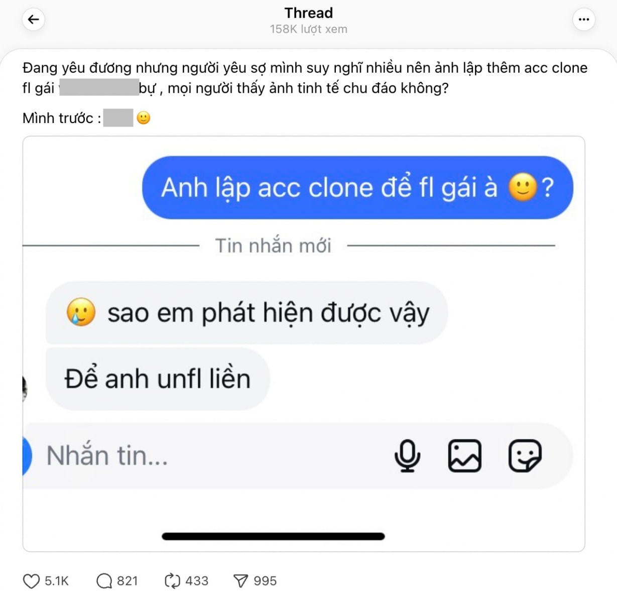 Nguyên văn bài đăng với giọng điệu mỉa mai của cô gái: “Đang yêu đương nhưng người yêu sợ mình suy nghĩ nhiều nên ảnh lập thêm acc clone follow gái. Mọi người thấy ảnh tinh tế chu đáo không? Mình trước: Không”.