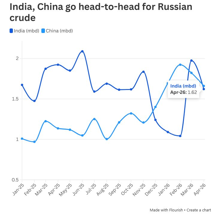 Dữ liệu từ Kpler cho thấy Trung Quốc đã nhập khẩu 1,8 triệu thùng dầu Nga mỗi ngày trong tháng 3. Tuy nhiên tính đến thời điểm hiện tại của tháng 4, cả Ấn Độ và Trung Quốc đang cạnh tranh trực diện khi mỗi bên đều mua được 1,6 triệu thùng/ngày dầu thô từ Nga.