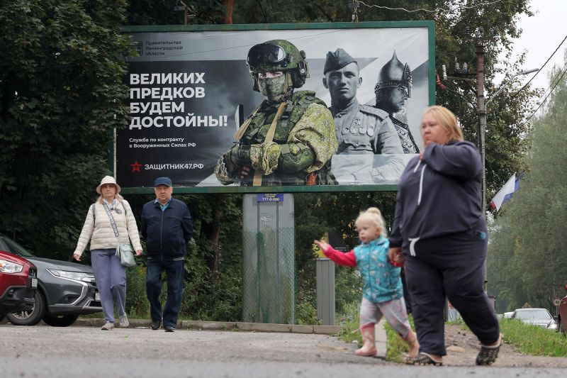 Người dân đi bộ gần một biển quảng cáo về các hợp đồng của Lực lượng Vũ trang Nga tại Vsevolozhsk, Nga vào ngày 30/8/2025. Ảnh: Reuters