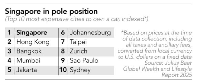 Theo Nikkei, Singapore từ lâu đã nổi tiếng là nơi đắt đỏ nhất thế giới để sở hữu một chiếc ô tô. Hệ thống Giấy chứng nhận quyền sở hữu xe (COE), vốn là tấm vé thông hành có thời hạn 10 năm, đã tăng giá gấp đôi trong một thập kỷ qua.
