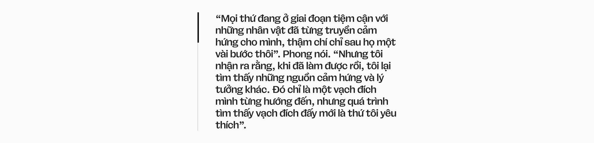 “Mọi thứ đang ở giai đoạn tiệm cận với những nhân vật đã từng truyền cảm hứng cho mình, thậm chí chỉ sau họ một vài bước thôi”. Phong nói. “Nhưng mà tôi thấy cũng chẳng có gì đặc biệt. Đó chỉ là một vạch đích mình từng hướng đến, nhưng quá trình tìm thấy vạch đích đấy mới là thứ tôi yêu thích. Bây giờ, tôi đang rất tận hưởng con đường hướng đến nó”.
