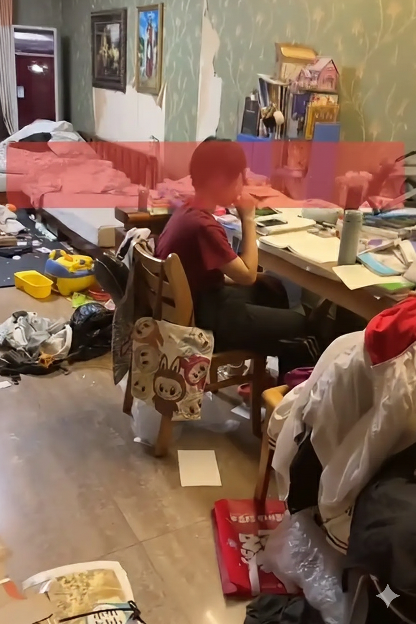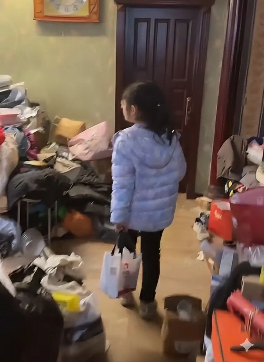 Qua ống kính máy quay, người ta thấy rác thải, giấy vụn và bìa carton cũ chất đống dọc hành lang. Sàn nhà cáu bẩn, bết dính những thứ chất lỏng không tên. Sách vở, tài liệu học tập của những đứa trẻ cũng nằm vất vưởng trong mớ hỗn độn. Từ những mảng giấy dán tường bong tróc đến đống đồ đạc ngổn ngang, ngôi nhà dường như không còn chỗ để đặt chân.