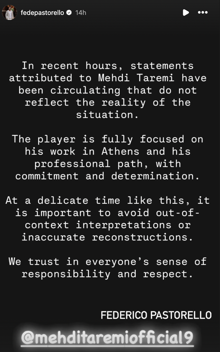 Không chỉ phía đại diện, lãnh đạo CLB Olympiacos - đội bóng Taremi đang thi đấu - cũng bác bỏ tin đồn, gọi đây là thông tin thất thiệt xuất phát từ mạng xã hội. Đội bóng khẳng định tiền đạo người Iran vẫn tập luyện và sinh hoạt bình thường, không có bất kỳ thay đổi nào liên quan đến tương lai của anh.