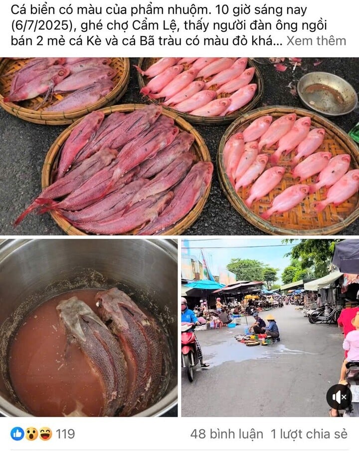 Theo nội dung bài viết, khoảng 10h ngày 6/7, tại chợ Cẩm Lệ, người này thấy một tiểu thương bày bán cá kè và cá bã trầu có màu đỏ lạ.