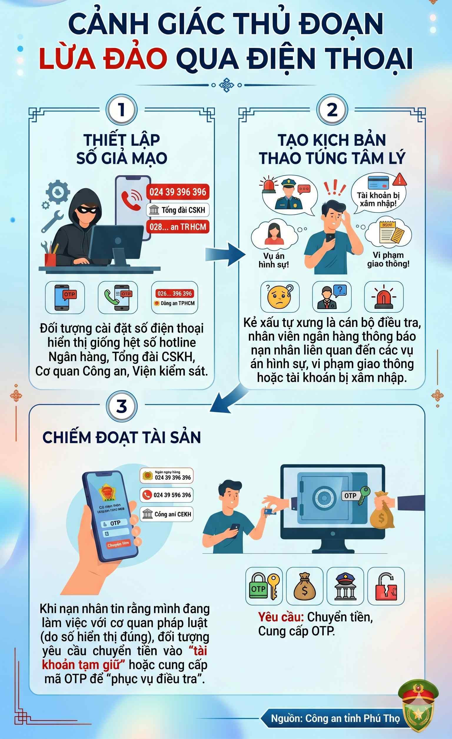 Sau đó, bọn chúng tạo kịch bản là cán bộ điều tra, nhân viên ngân hàng...để thao túng tâm lý. Khi nạn nhân tin rằng mình đang làm việc với cơ quan pháp luật (do số hiển thị trên màn hình đúng với số công khai trên mạng), đối tượng yêu cầu nạn nhân chuyển tiền vào “tài khoản tạm giữ” hoặc cung cấp mã OTP để “phục vụ điều tra”.