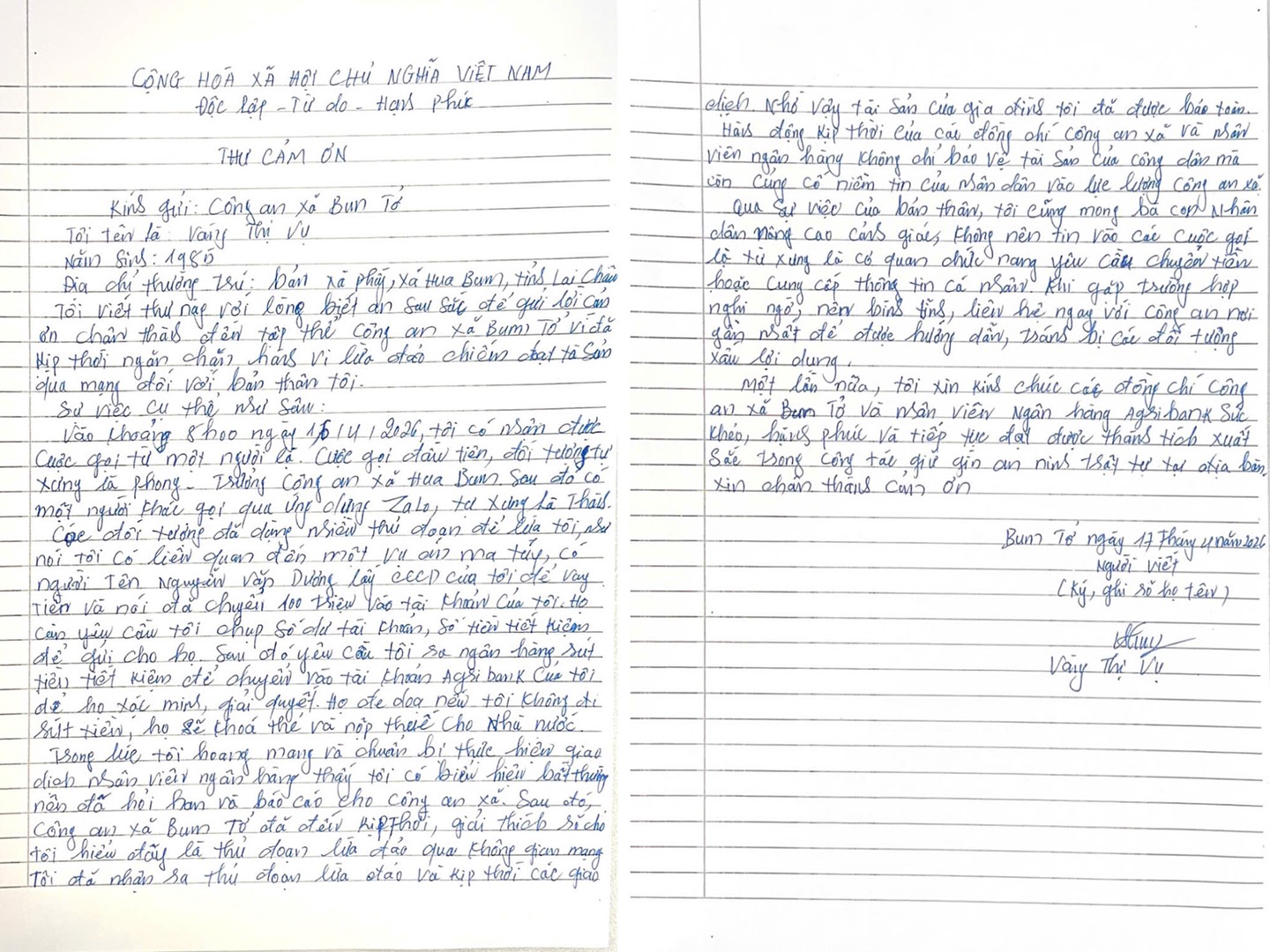 Sau sự việc, chị đã gửi thư bày tỏ sự cảm ơn tới lực lượng Công an xã Bum Tở và cán bộ ngân hàng vì đã kịp thời phát hiện, ngăn chặn hành vi lừa đảo, giúp bảo vệ tài sản cho người dân.