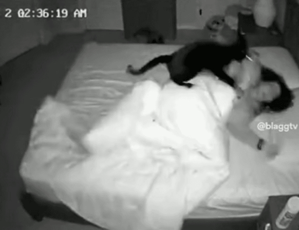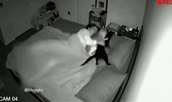 Chủ nhà cho biết camera an ninh trong nhà đã ghi lại cùng một sự việc lặp đi lặp lại mỗi đêm. Cô đăng tải các đoạn video lên kênh cá nhân của mình, cho thấy nhiều con mèo của cô đuổi nhau quanh giường như thể đang chơi ở sân chơi, nhảy lên gối, leo trèo trên nệm và chơi đùa rất hăng say, hầu như không để ý đến việc chủ nhân của chúng có đang ngủ hay không.