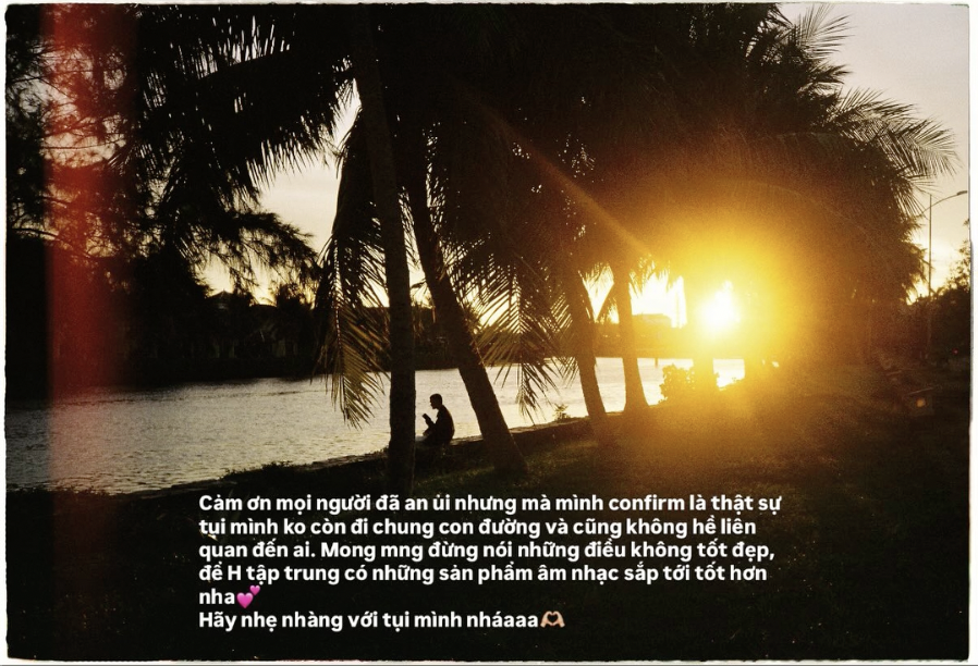 Sau đó cô đăng story khẳng định chuyện chia tay không liên quan đến người thứ 3, mong mọi người nhẹ nhàng với cả hai: “Cảm ơn mọi người đã an ủi nhưng mà mình confirm là thật sự tụi mình không còn đi chung con đường và cũng hề liên quan đến ai. Mong mọi người đừng nói những điều không tốt đẹp để Hùng tập trung có những sản phẩm âm nhạc sắp tới tốt hơn nha. Hãy nhẹ nhàng với tụi mình nhá”.