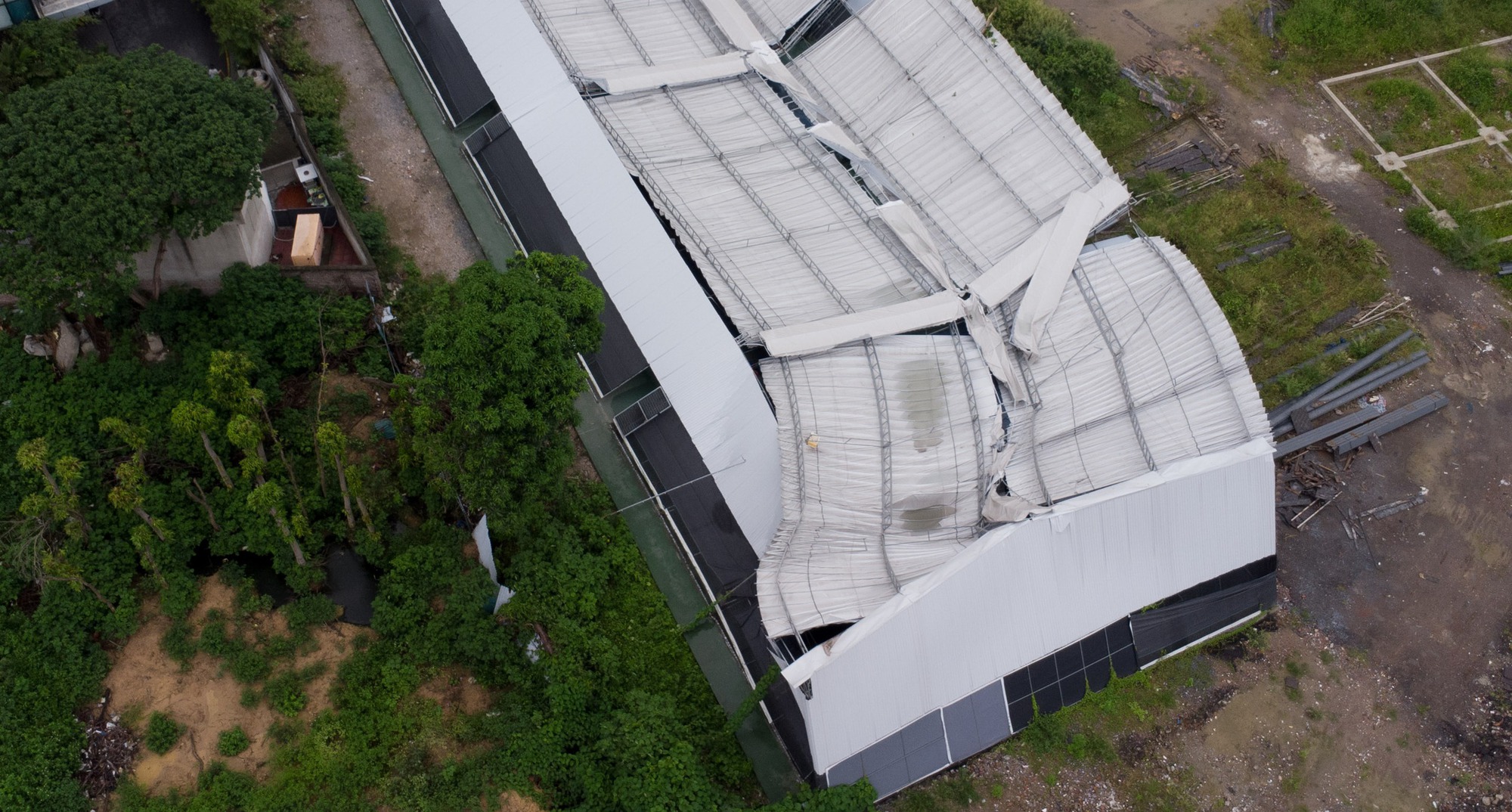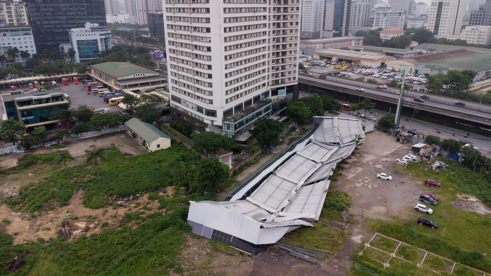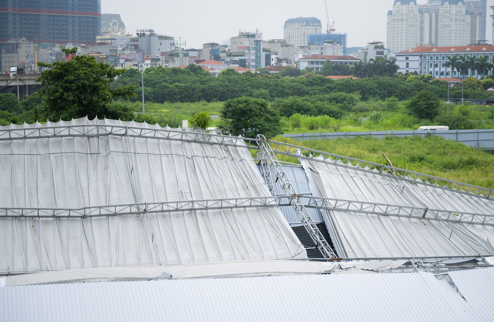 Khung sắt, mái tôn và cột chống đỡ nằm ngổn ngang, hư hỏng nghiêm trọng