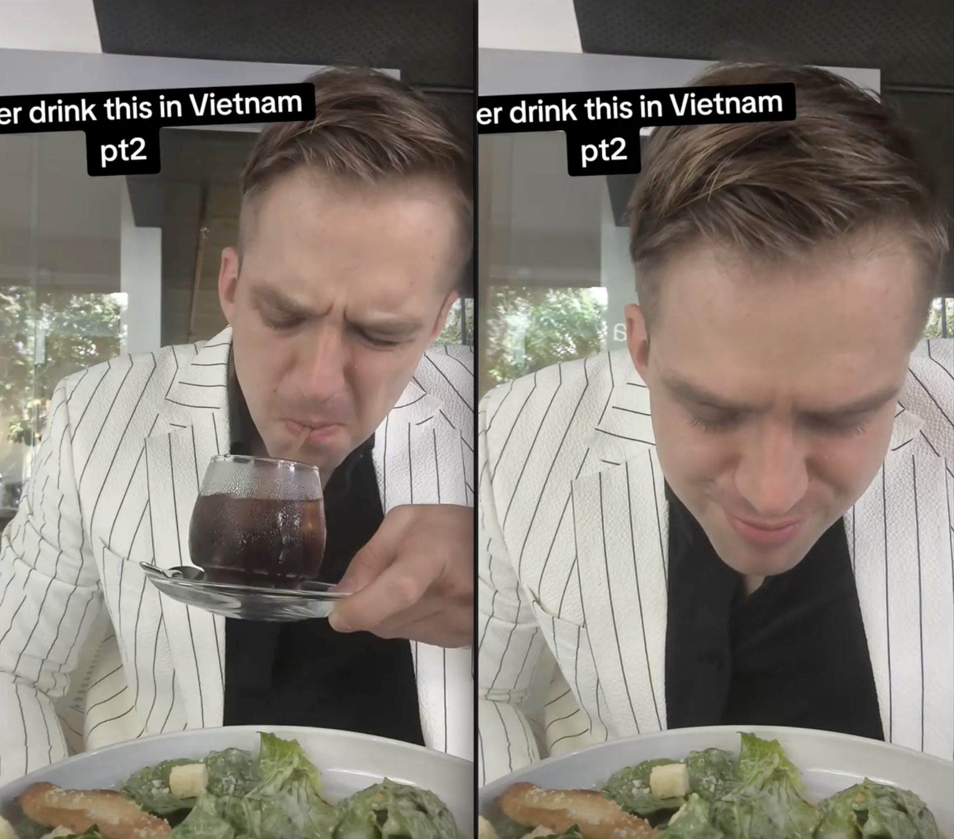 Đôi mắt mở to, lông mày nhướng lên, rồi bật cười đầy bất ngờ. Anh chia sẻ ngay sau đó: "Tôi chấp nhận thử thách uống cà phê đen, không sữa, không đường, không thêm gì cả. Cà phê Việt Nam đúng là một đẳng cấp khác."