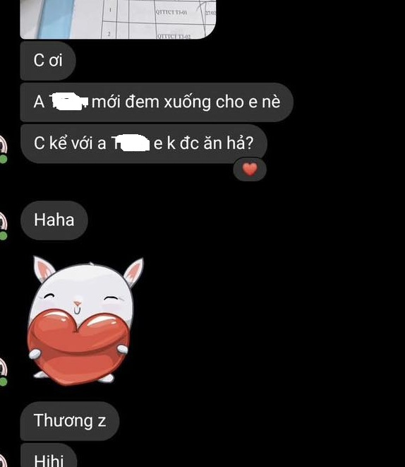 Kèm theo đó là dòng tin nhắn khiến người đọc sôi sục của cô A gửi cho vợ sếp: "Chị ơi, anh T. mới đem xuống cho em nè. Chị kể với anh T. em không được ăn hả? Haha... Thương quá... Hihi".