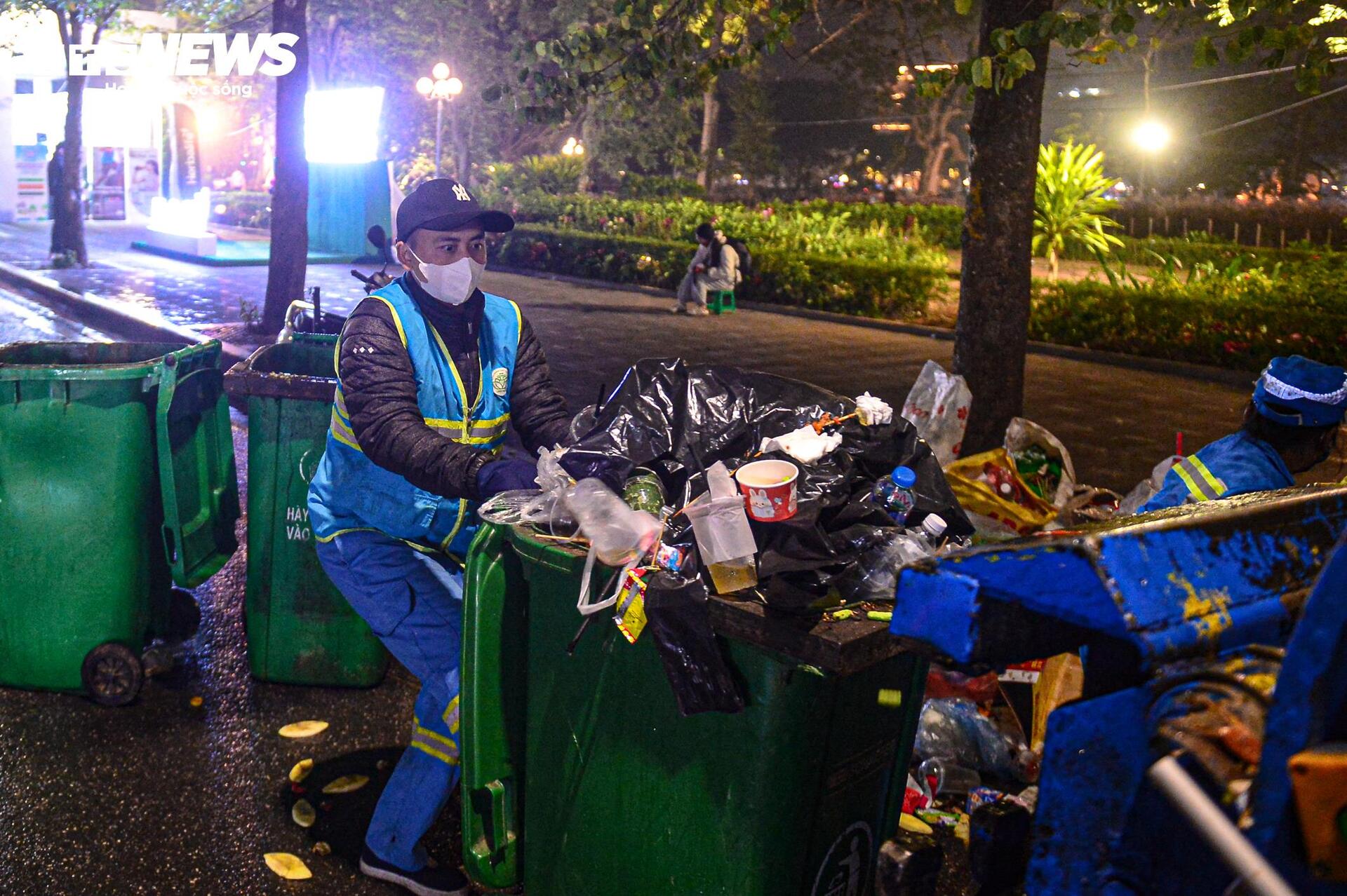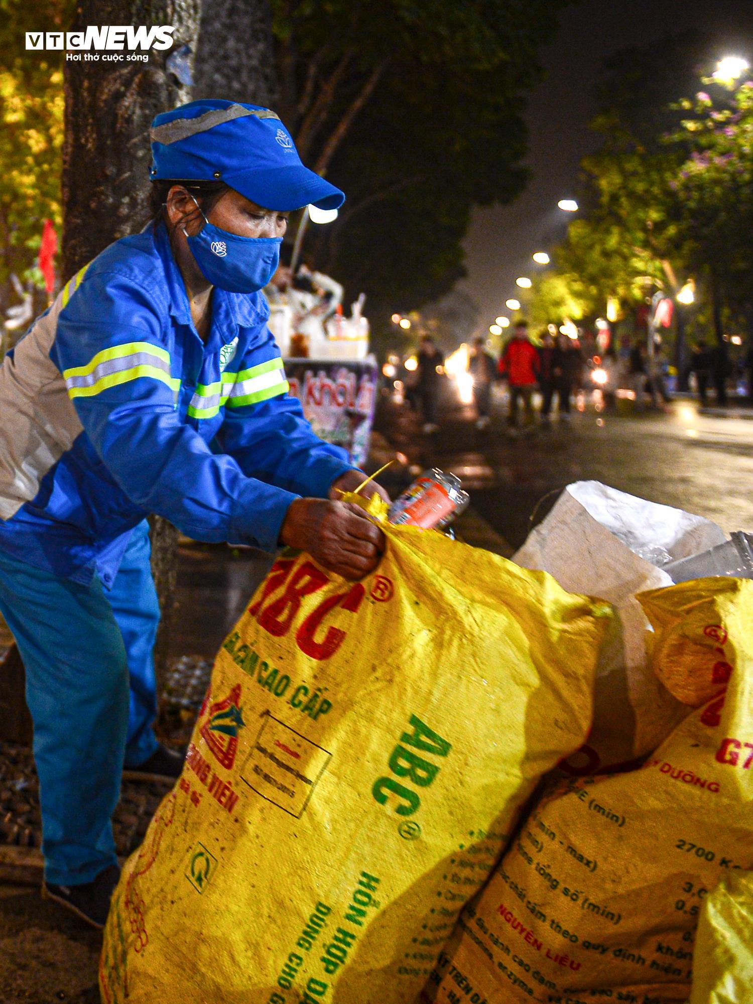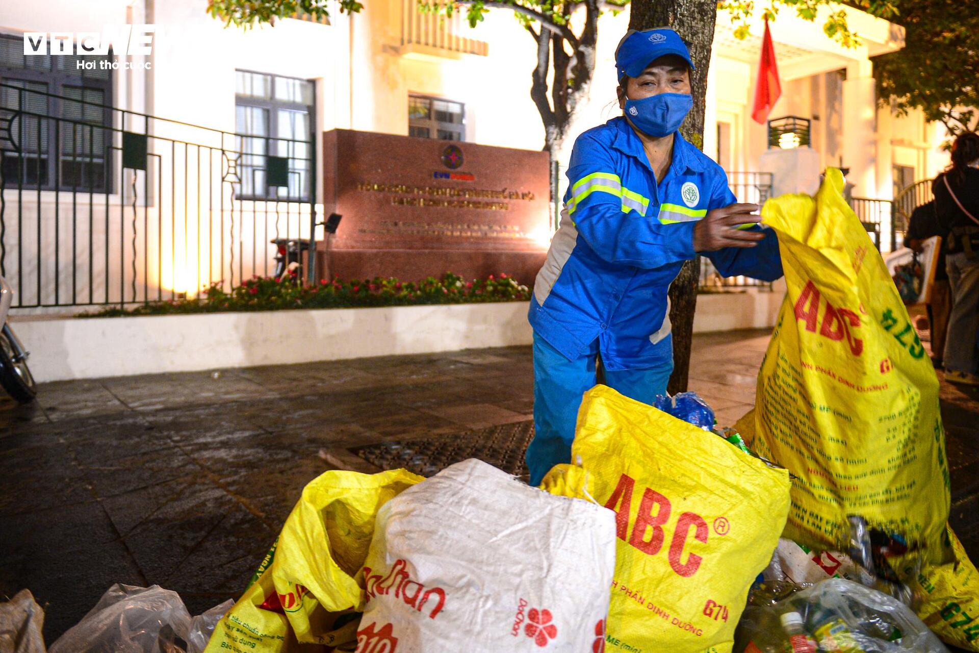 "Hôm nay rác nhiều gấp cả chục lần so với ngày thường, dọn rất cực. Những hôm tổ chức sự kiện lớn như này chúng tôi xác định sẽ phải thức trắng đêm để dọn dẹp", chị Hoa (nhân viên Xí nghiệp môi trường đô thị số 2, quận Hoàn Kiếm) nói.