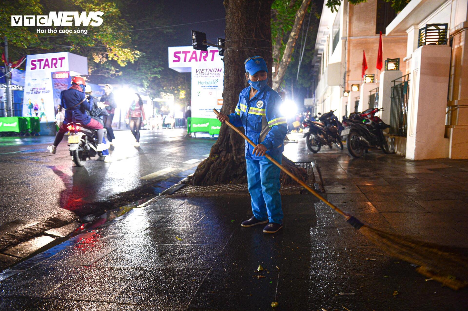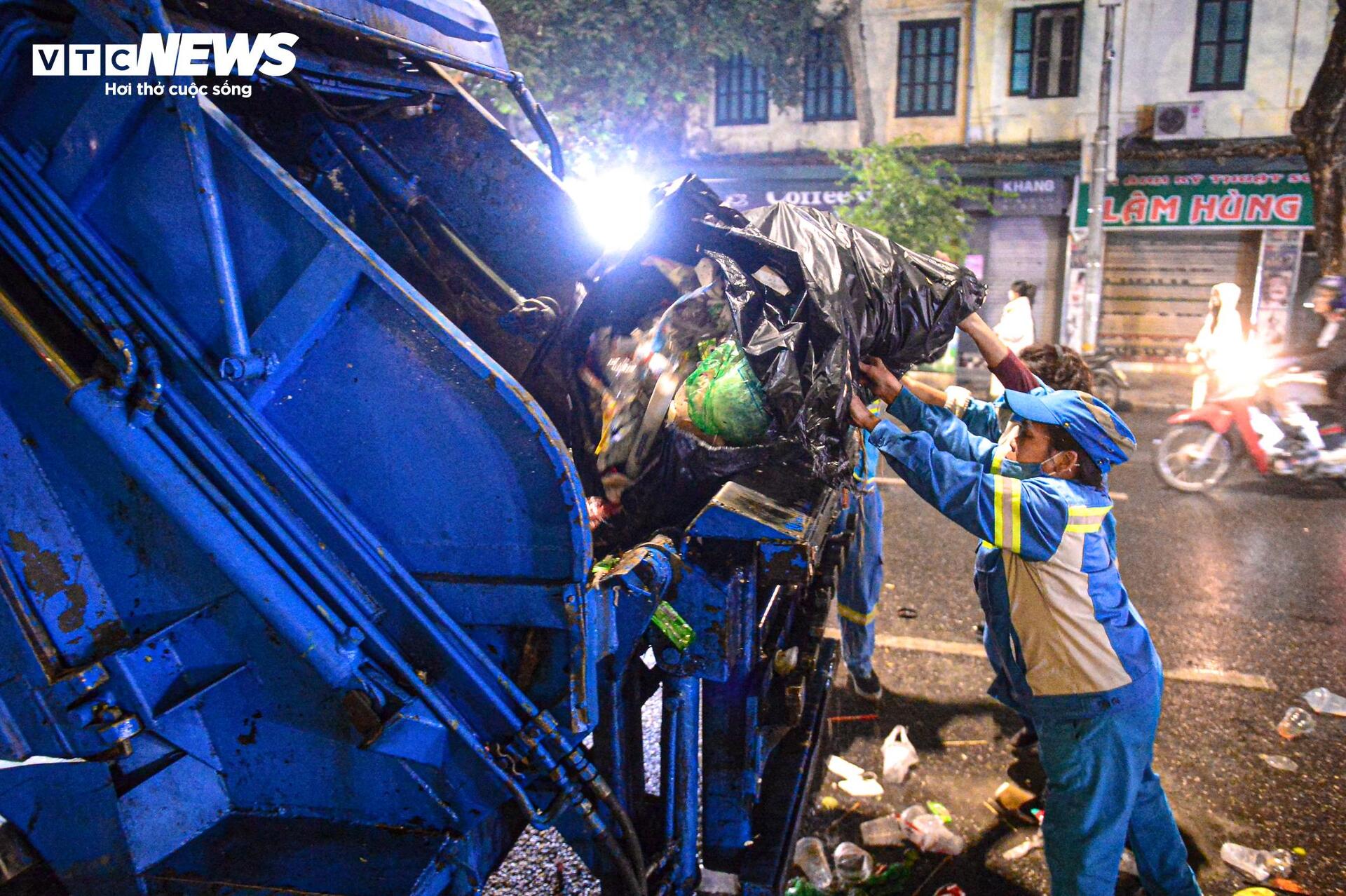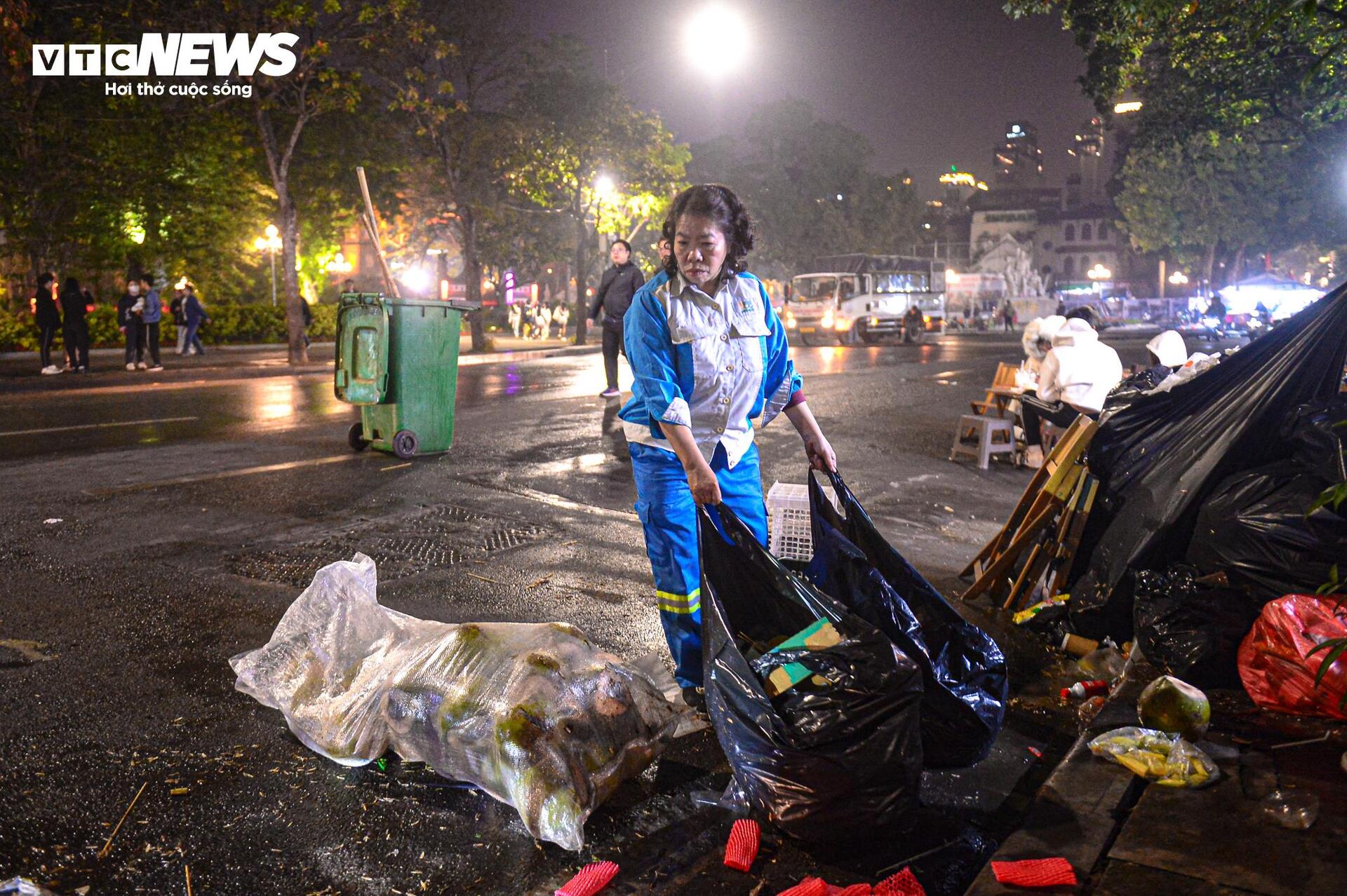 "Hôm nay rác nhiều gấp cả chục lần so với ngày thường, dọn rất cực. Những hôm tổ chức sự kiện lớn như này chúng tôi xác định sẽ phải thức trắng đêm để dọn dẹp", chị Hoa (nhân viên Xí nghiệp môi trường đô thị số 2, quận Hoàn Kiếm) nói.