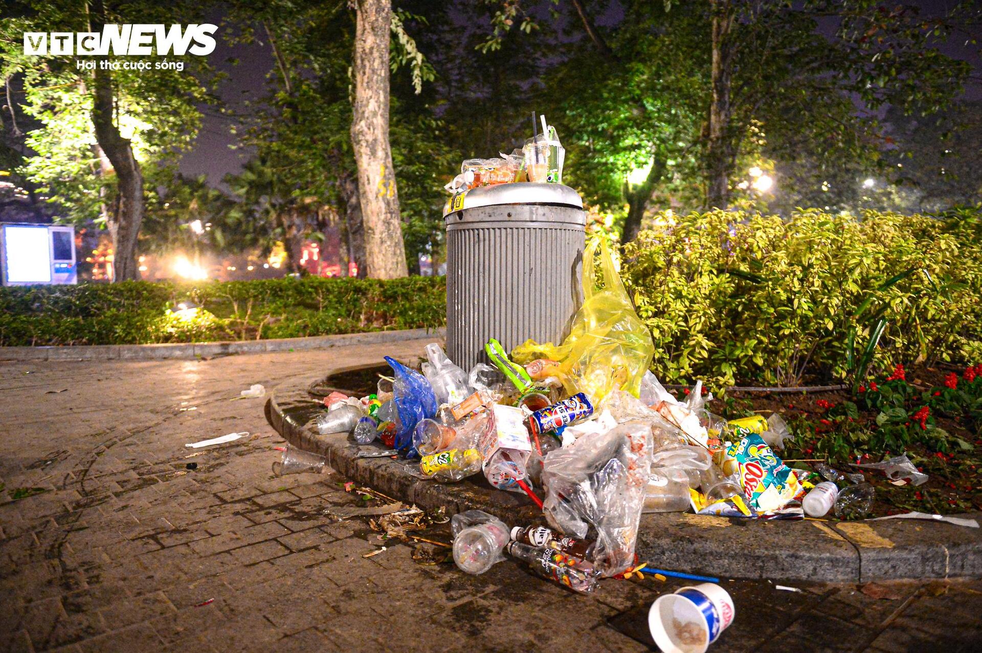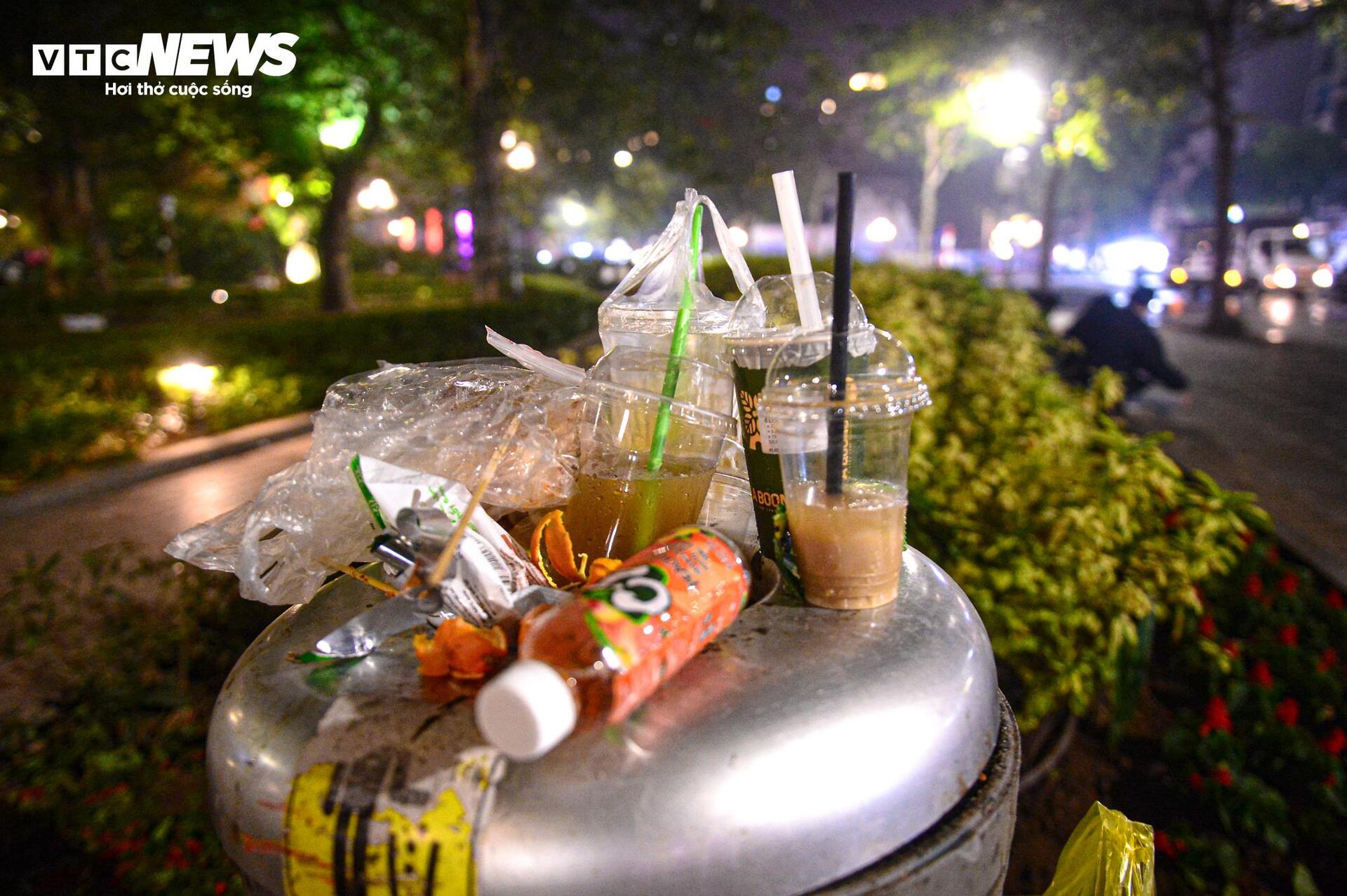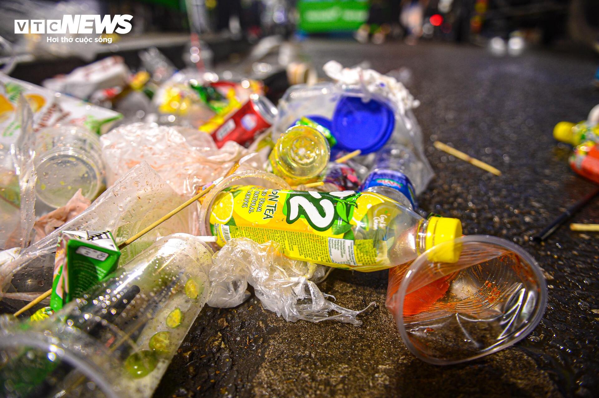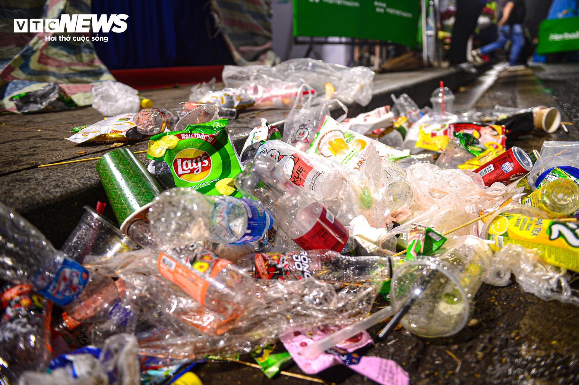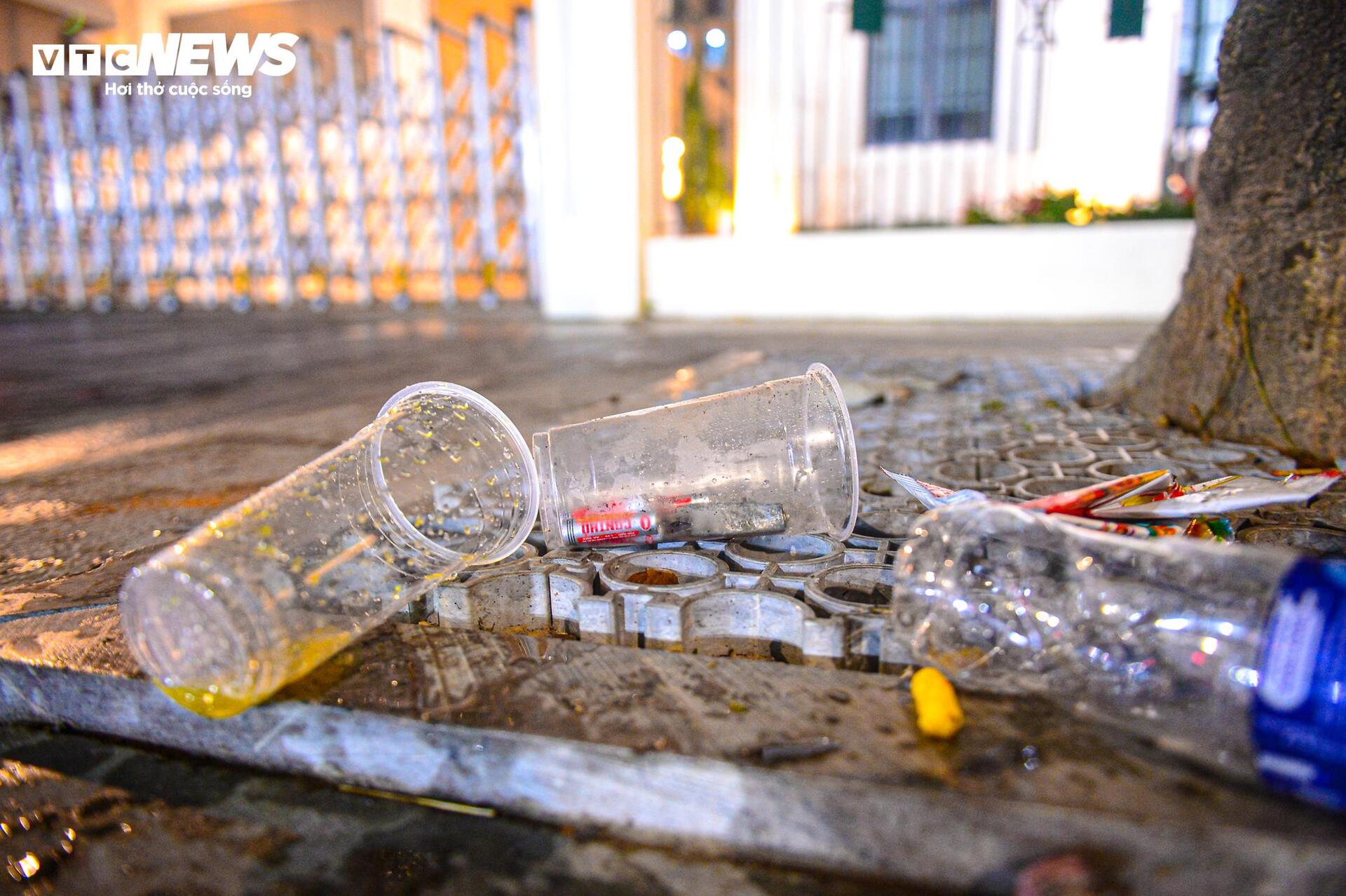 Theo ghi nhận của PV Báo điện tử VTC News khoảng 3h ngày 1/1, dọc tuyến phố đi bộ Hồ Gươm, chai nhựa, khăn giấy, hộp thức ăn... nằm vương vãi khắp nơi.