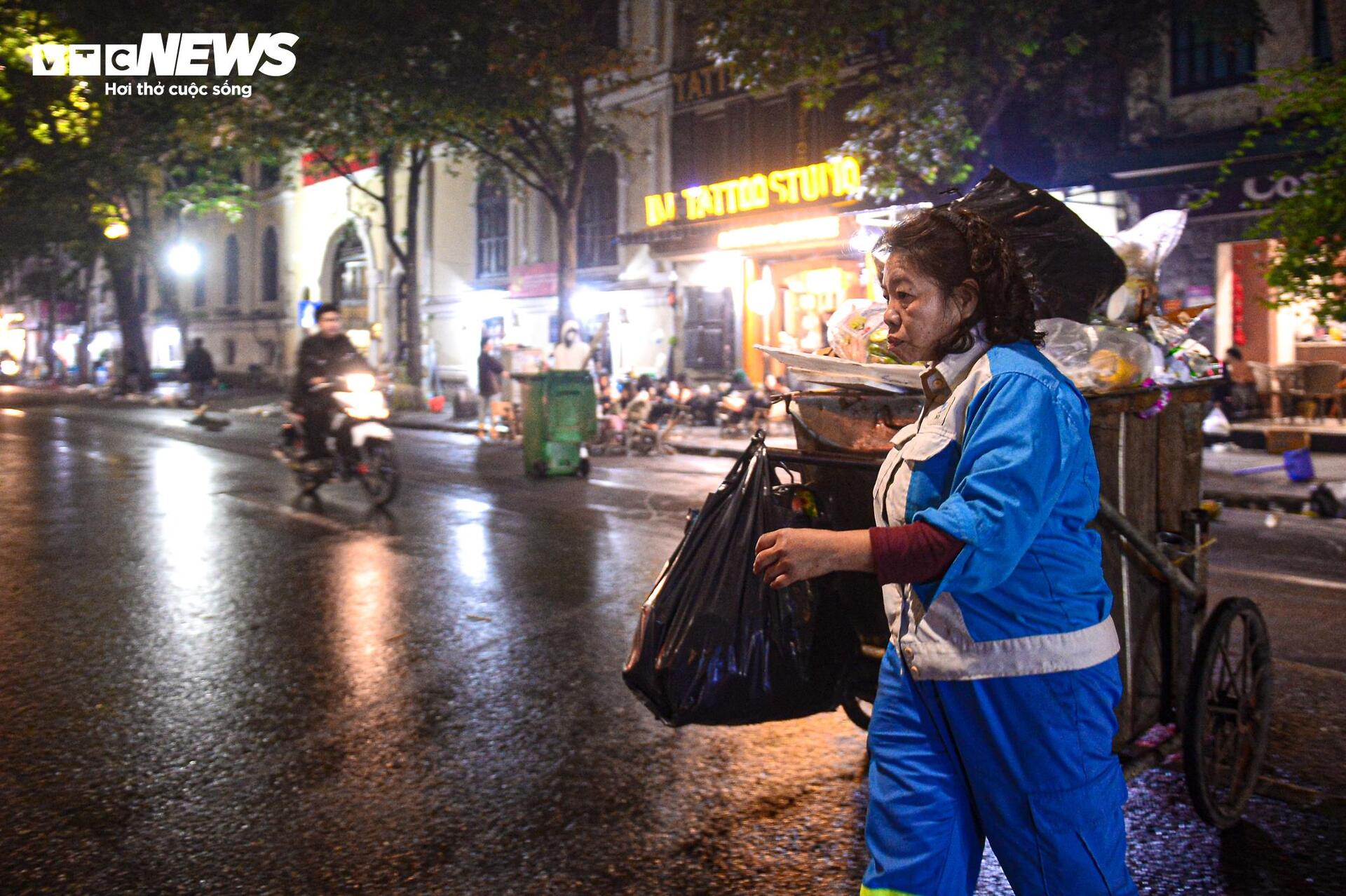 Khi người dân trở về nhà cũng là lúc các lao công bắt đầu vất vả dọn dẹp rác để làm sạch trên các con phố đi bộ quanh hồ Gươm.