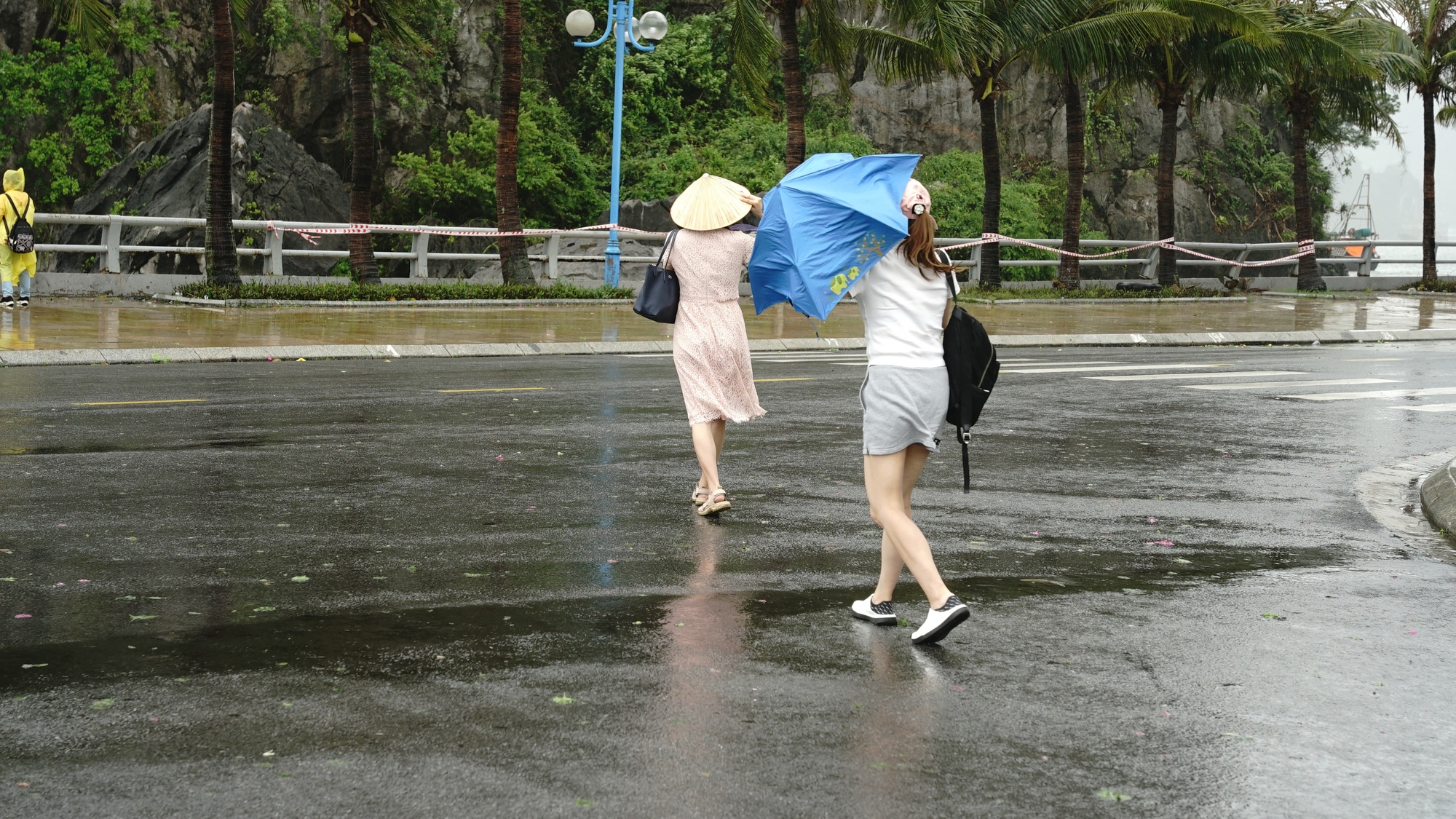 Mặc cho gió mạnh kèm mưa, nhiều du khách ở Quảng Ninh vẫn liều lĩnh bung ô ra đường ven biển để chụp hình “sống ảo” khi bão vừa đổ bộ.