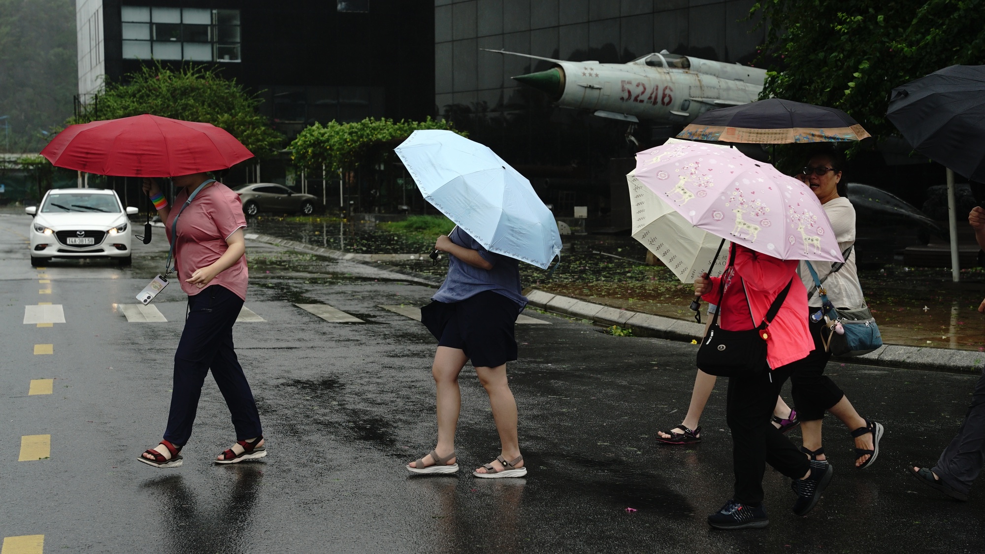 Gió thổi mạnh, nhiều người cố gắng ghìm chiếc ô lại để không bị thổi bay