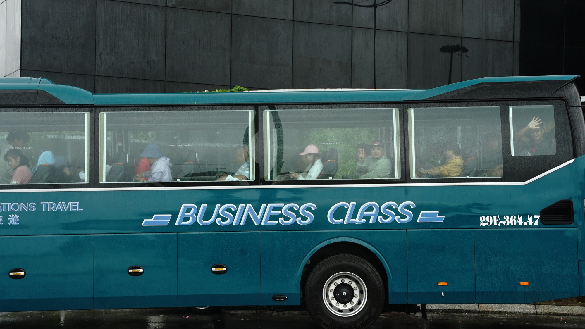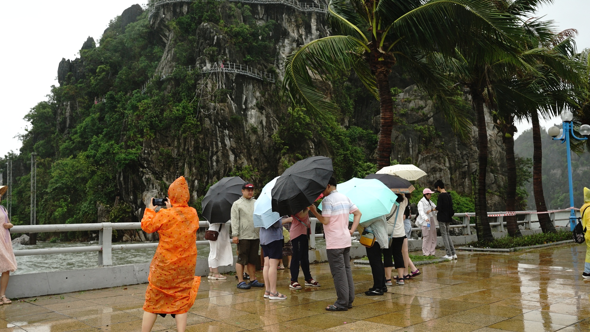 Bất chấp thời tiết mưa bão, một nhóm du khách vẫn đi tham quan các địa điểm ở Quảng Ninh bằng xe ô tô