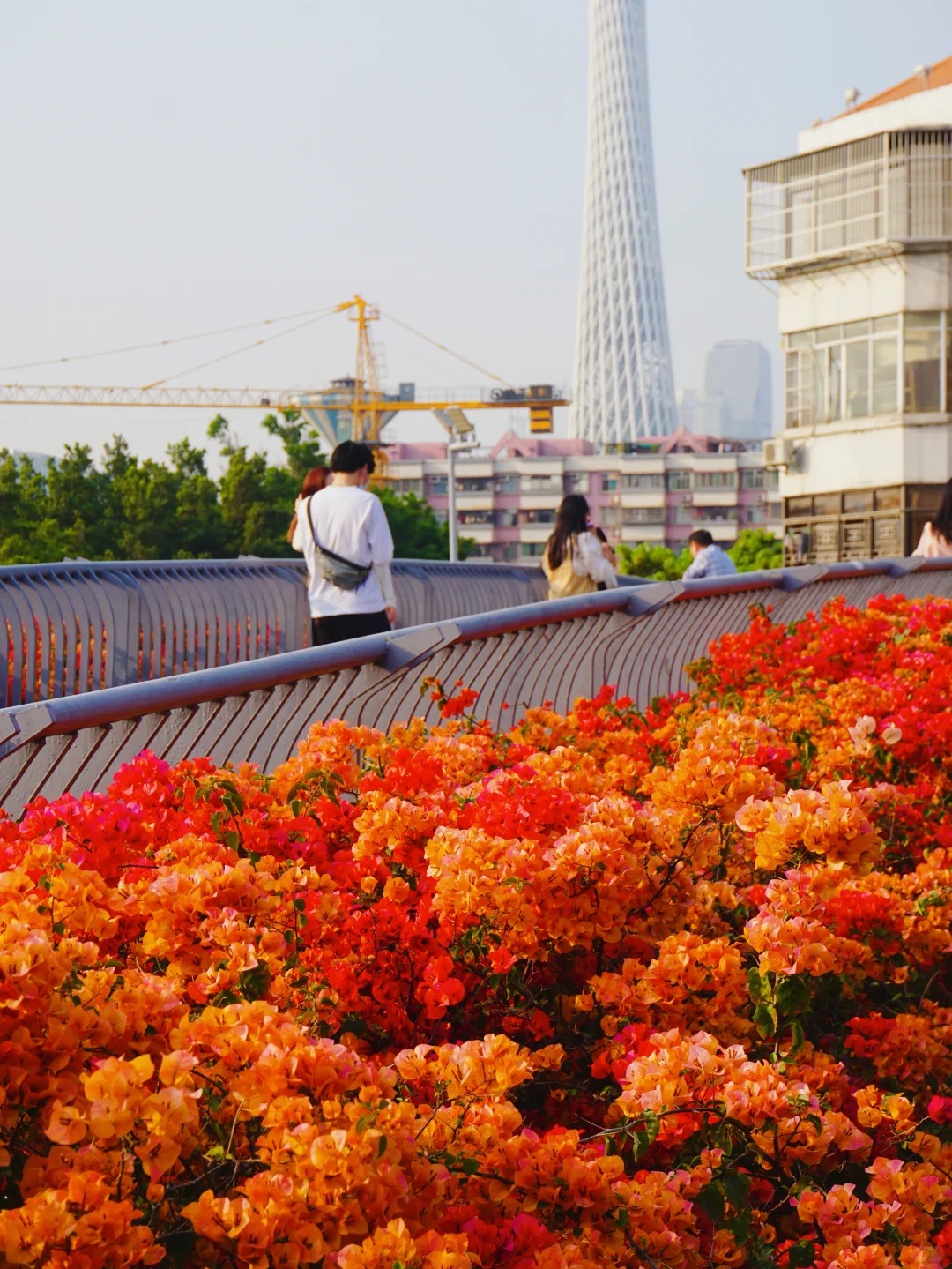 Trong tháng 3-4, khu cầu vượt sẽ lại được phủ kín bởi những dải hoa giấy đủ màu sắc, cả cây cầu sẽ như một thác nước vàng cam rực rỡ, đẹp đến ngỡ ngàng. Trên cầu, bạn còn có thể chụp được những bức ảnh hoa giấy cùng tháp Canton trong khung hình, dưới nền trời xanh mây trắng, mỗi bức ảnh đều là một kiệt tác.