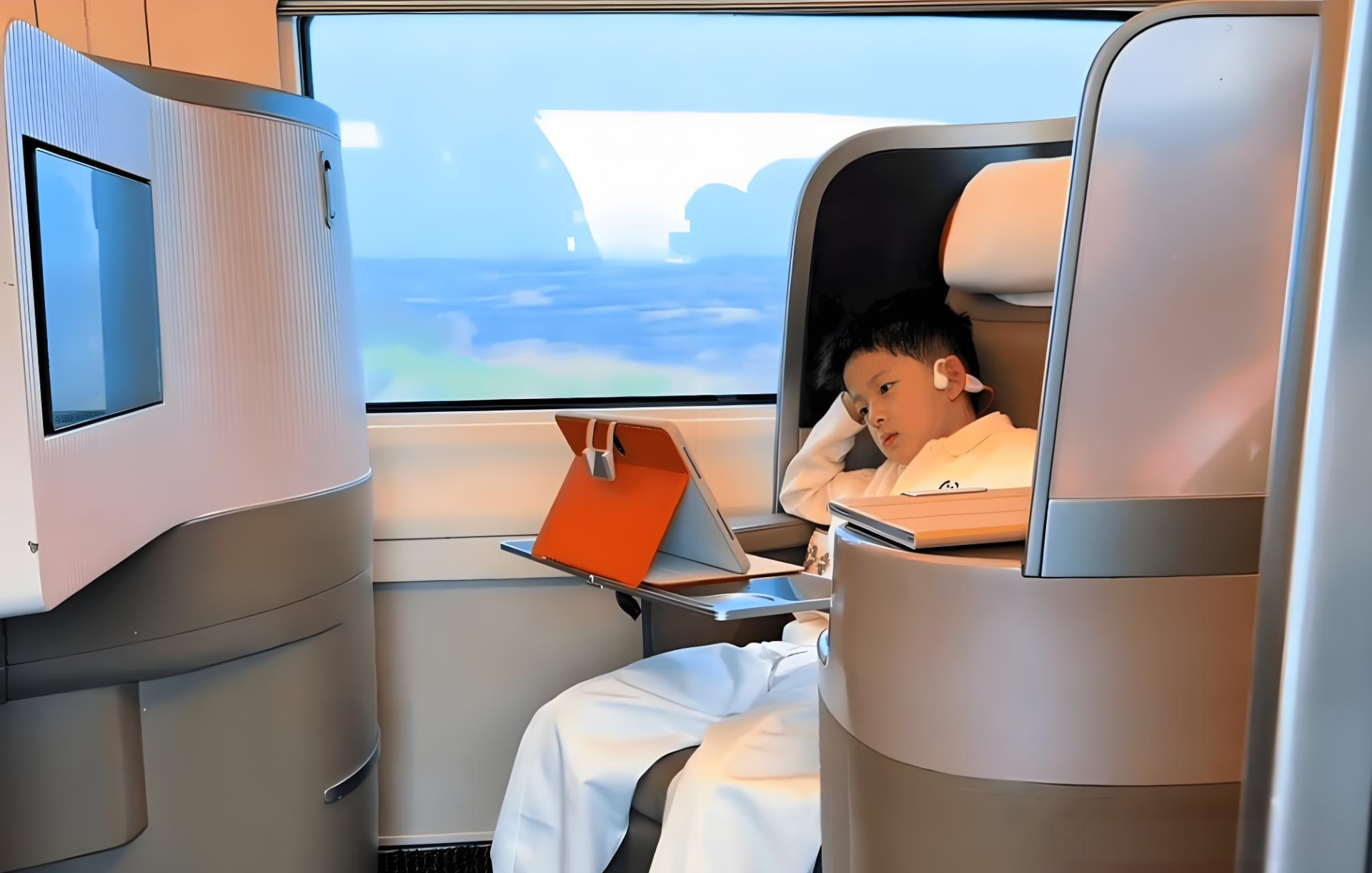 Hình ảnh cậu bé ngồi trong khoang thương gia tàu cao tốc gây bão (Ảnh chụp màn hình)